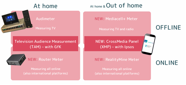 Deze aanpak maakt het mogelijk om zoveel mogelijk mediaconsumptie (voornamelijk video en audio) te meten, zowel thuis als buitenshuis, vanuit één enkele bron. Dit vormt de single source of truth voor crossmediale meting.